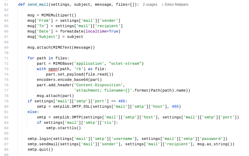 Voor een klant werd een python script geschreven, welke periodiek inventariseert welke bestanden er in een map zijn toegevoegd sinds de laatste keer dat het script heeft gedraaid. De resulterende set bestanden worden middels TLS beveiligde e-mail doorgezet naar een belanghebbende. Het script draait automatisch volgens een schema, waardoor de ontvanger altijd tijdig over de gevraagde informatie beschikt